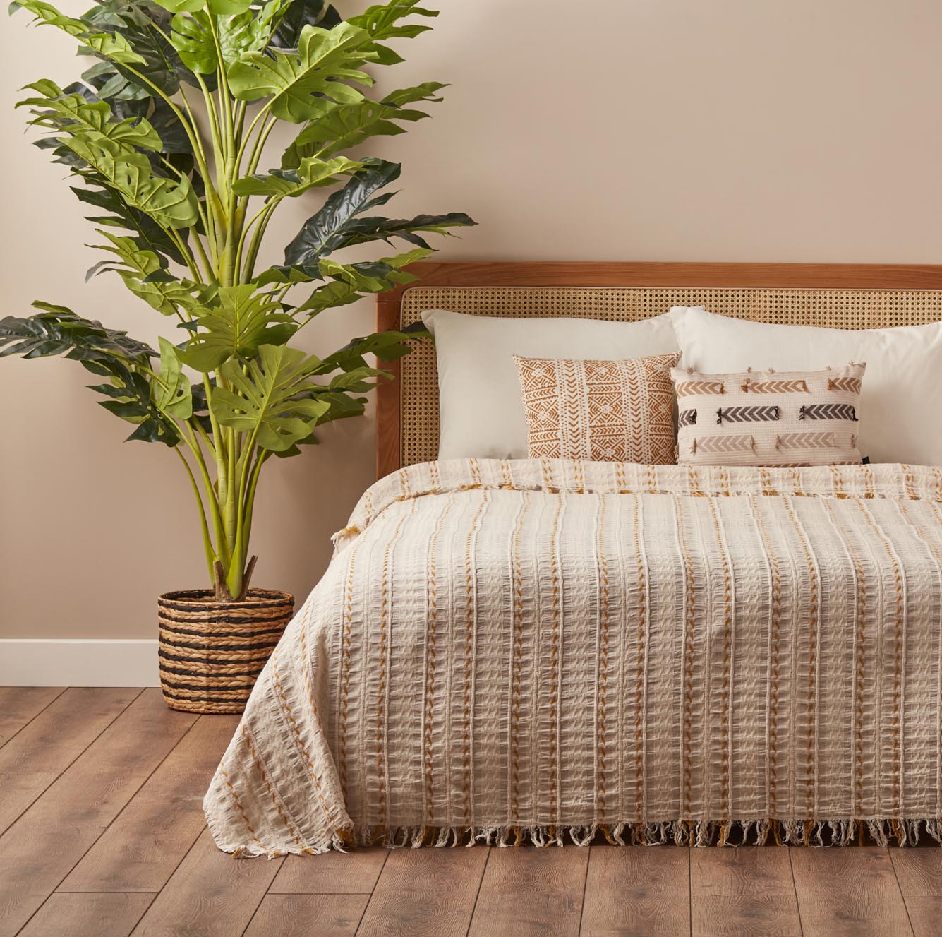 İplik boya dokuma yatak örtüsü. Ürün %100 Türk malı olup. OEKO-TEX ve BSCI sertifikalıdır. Kanserojen ve alerjen metaller içermez. Cildi tahriş etmez ve insan sağlığına zarar vermez. Sağlığımız için risk teşkil eden azoik boya kullanılmaz. 30 Derecede yıkanabilir, düşük ısıda ütülenebilir, Düşük devirde sıkma yapılabilir, Ağartıcı kullanılmaz, Benzer renklerle yıkanabilir.