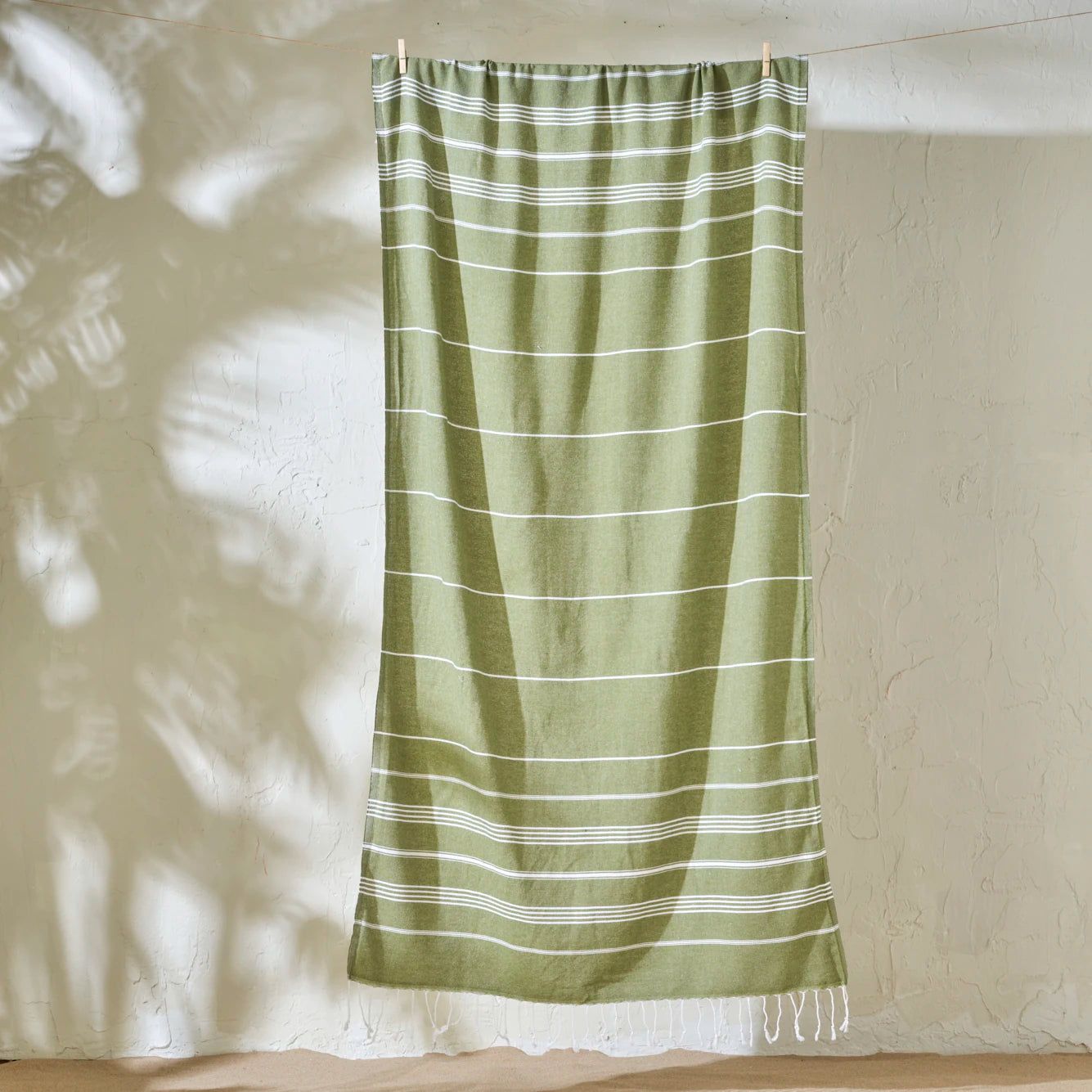 95x180 cm ebadında yeşil renkli Alora Peştemal. Pamuklu dokusu ve yüksek nem emici özelliğiyle hızlı ve etkili kurulama sağlar. Az yer kaplar ve kolay taşınır. Banyo, plaj, havuz ve sauna gibi farklı alanlarda kullanıma uygundur. 30 derecede çamaşır makinesinde yıkanabilir. Kurutma makinası önerilmez.